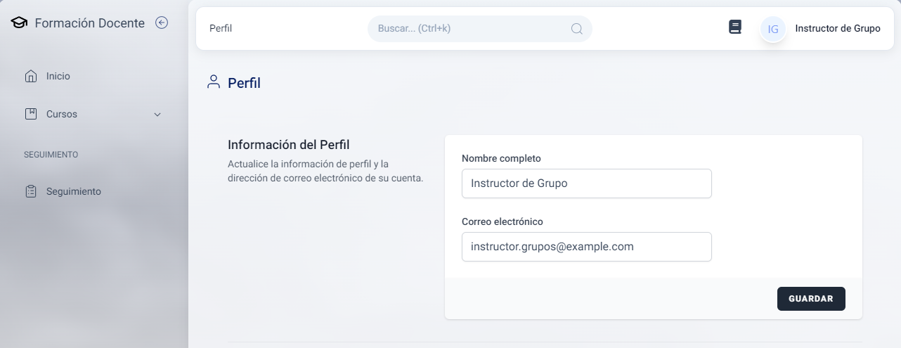 Si selecciona la opción Perfil, aparecerá un formulario con la Información del perfil donde podrá editar su nombre y correo electrónico.