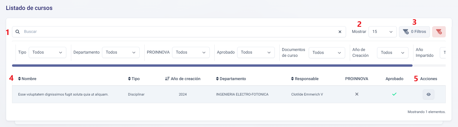 Los cursos registrados en el sistema pertenecientes al grupo en el que usted es instructor son enlistados en el Listado de Cursos, donde se pueden visualizar los registros con las siguientes columnas: