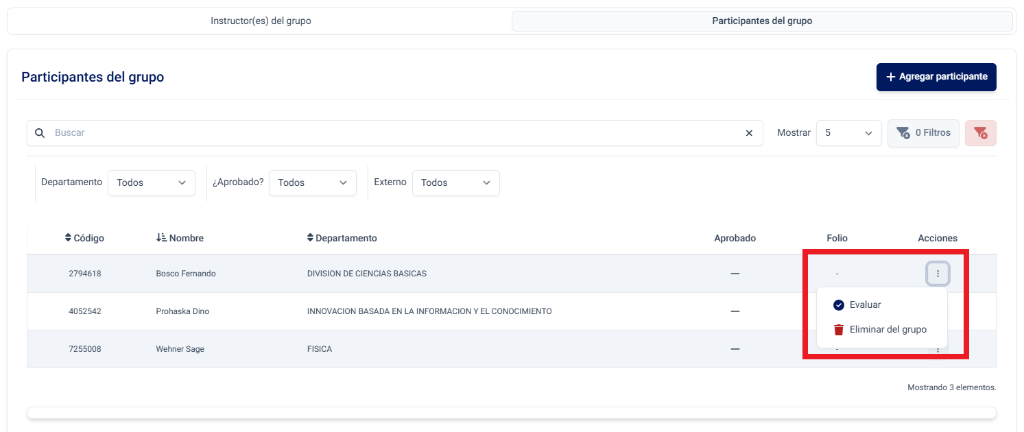 Para acceder a estas funcionalidades, debe dirigirse a las acciones en el listado de participantes que se encuentra en los Detalles de un Grupo.