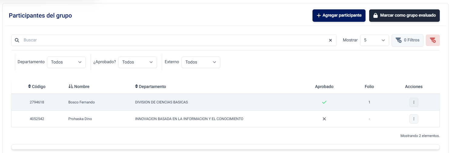 Después de evaluar, el listado de participantes se mostrará de la siguiente manera: