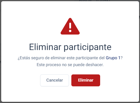 Para eliminar a un participante del grupo, seleccione la acción Eliminar del grupo en el listado de participantes. Al presionar esta acción, se mostrará una alerta como la siguiente: