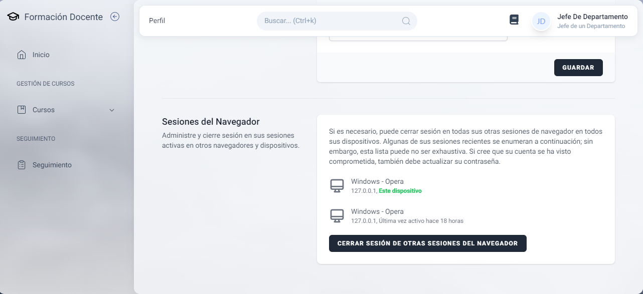 Un poco más abajo, se muestra otra sección para el cierre de sesiones activas con su Perfil, desde aquí puede cerrar todas sus sesiones si lo desea.