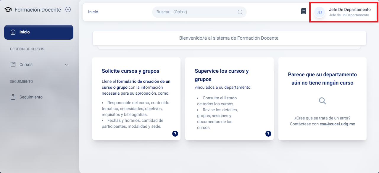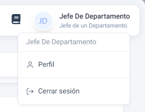 El sistema dispone de una sección para editar la información básica de su cuenta. Para acceder a esta sección, diríjase a la parte superior derecha del sistema, donde encontrará un apartado con su nombre y cargo.
