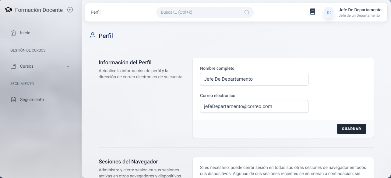 Si selecciona la opción Perfil, aparecerá un formulario con la Información del perfil donde podrá editar su nombre y correo electrónico.