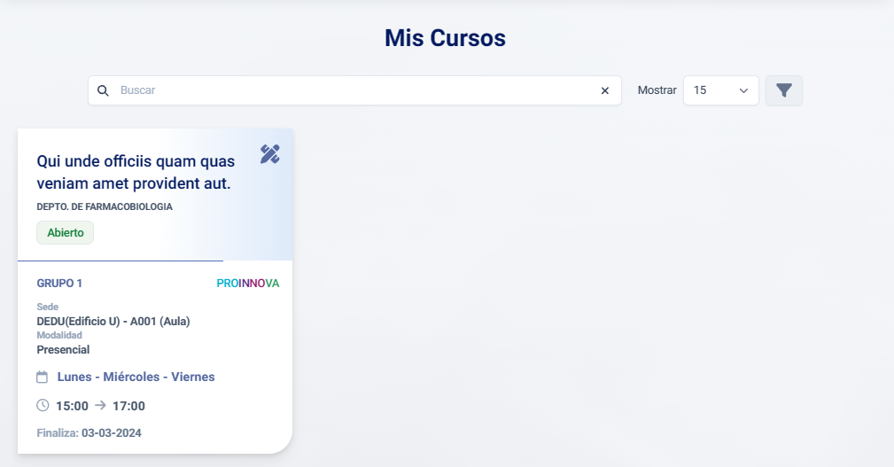 Determina la cantidad de cursos a mostrar por página (15/30/50/100).