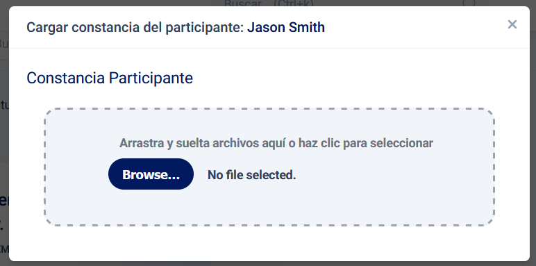 Al dar click en el botón de Constancia se abrirá una ventana modal donde se podrá descargar el archivo. En caso de tratarse de un curso perteneciente al histórico, el participante pude subir la constancia que le fue emitida para el mismo.
