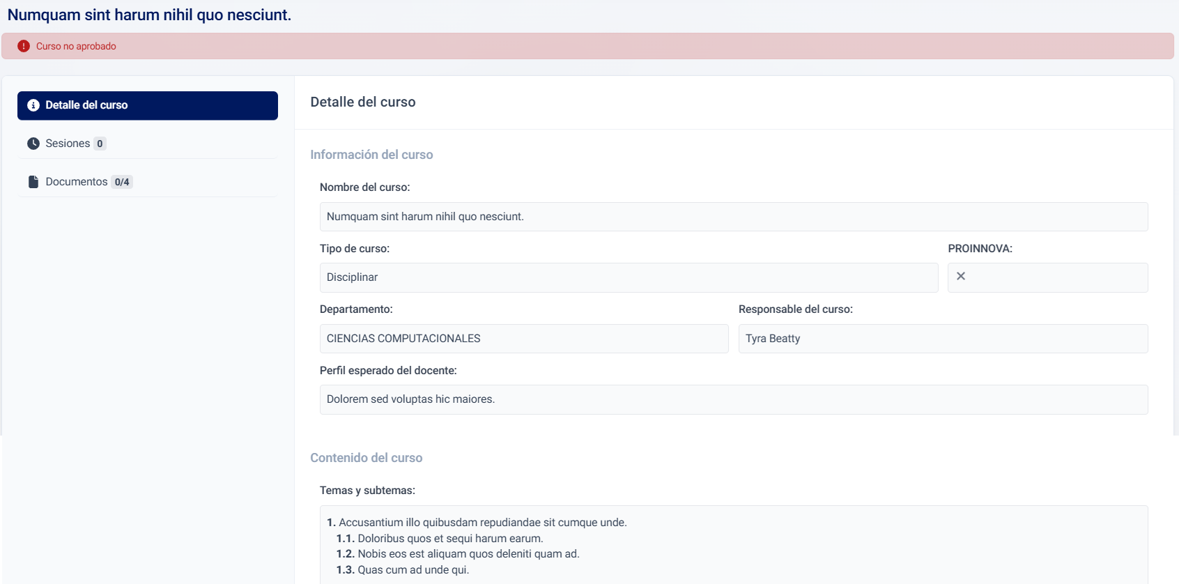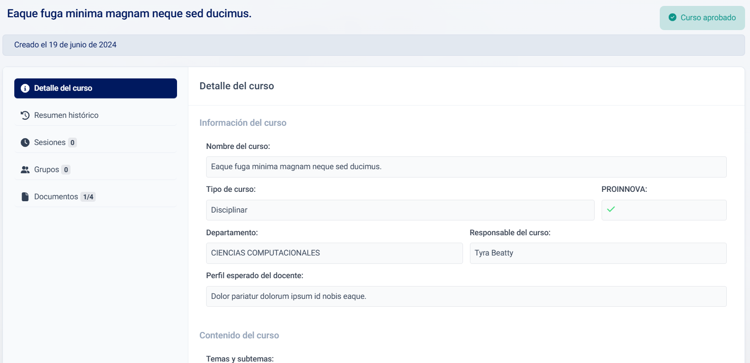 En el detalle de un curso se puede visualizar la información más relevante sobre el mismo. Cada curso pasa por un proceso de aprobación, por lo que pueden existir cursos aprobados y no aprobados.