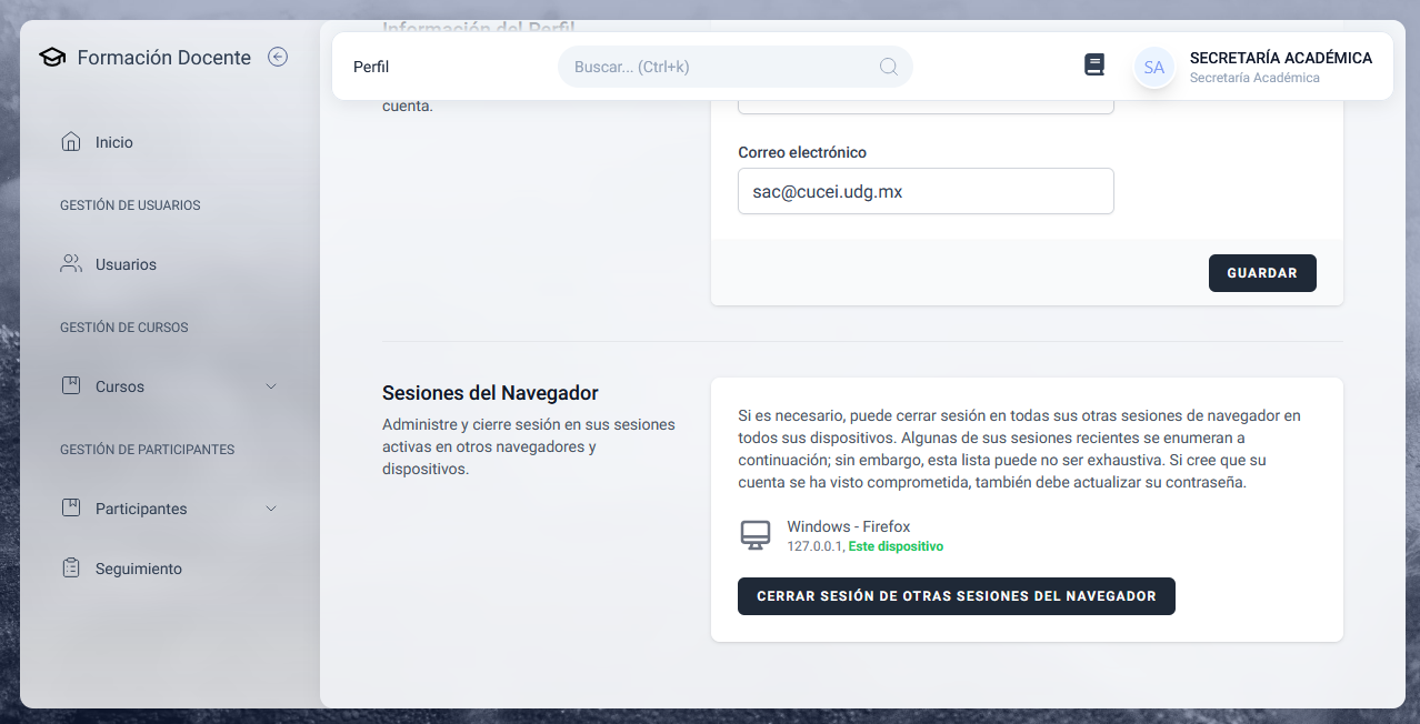 Al hacer clic en este apartado, se desplegarán dos opciones adicionales: Perfil, para la visualización de la información de registro, y Cerrar sesión, la cual permite salir del sistema.