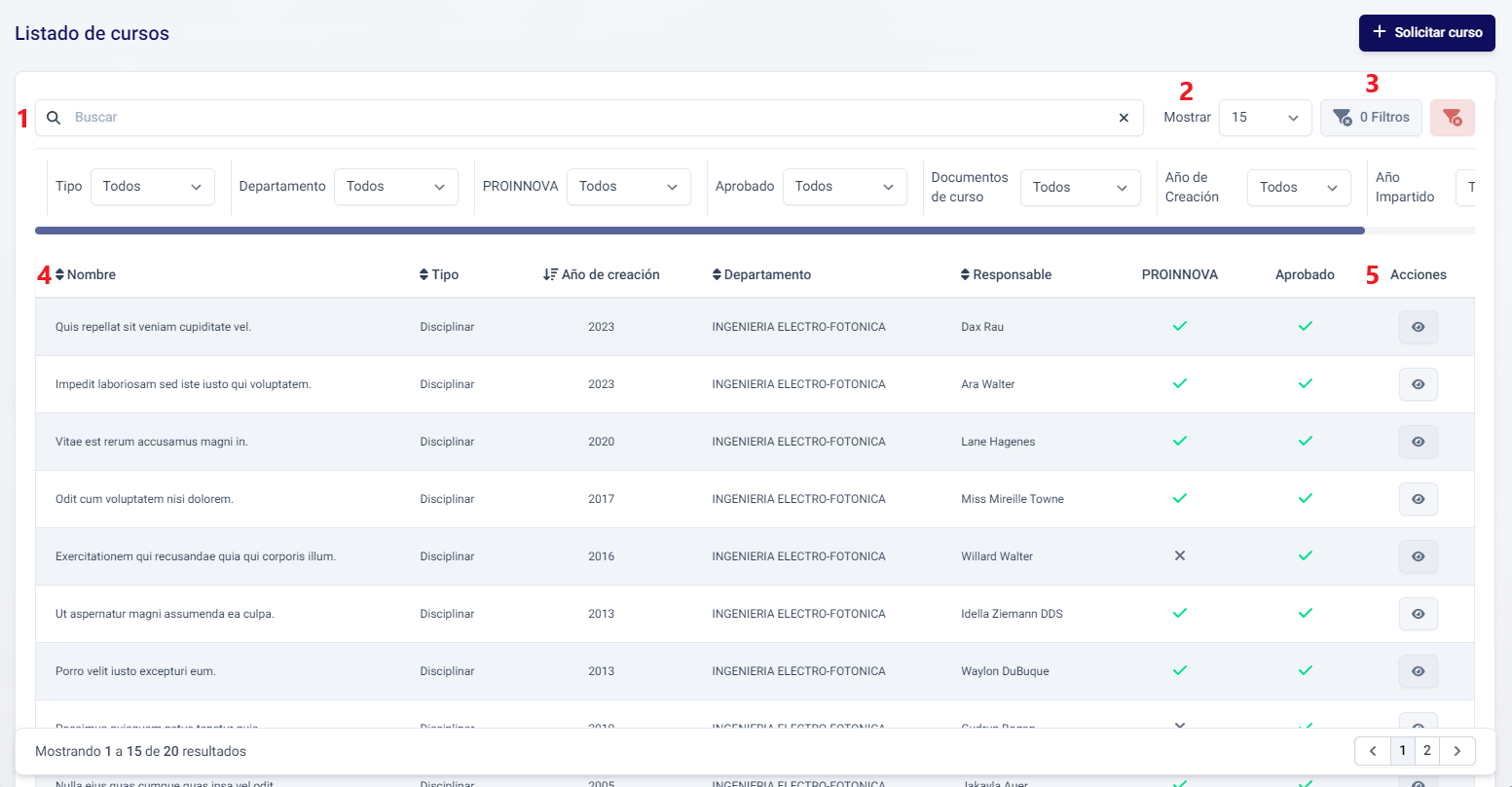 Todos los cursos en el sistema son enlistados en el Listado de Cursos, donde se pueden visualizar los registros con las siguientes columnas: