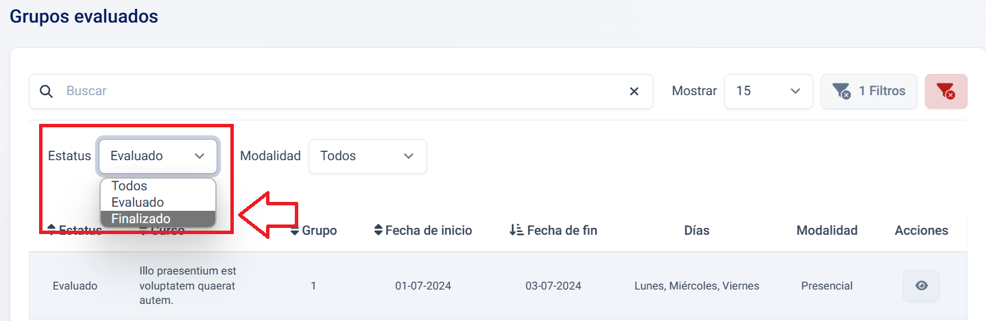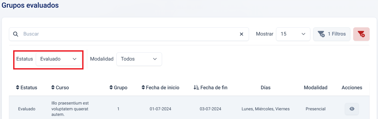 {warning} El listado está por defecto filtrado para mostrar solo los grupos evaluados, para cambiarlo consulte Cambiar filtro del listado.