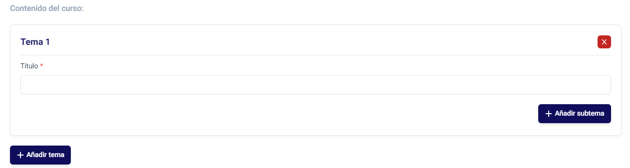 Aquí se crea el temario del curso. Se pueden generar varios temas y subtemas para definir la estructura y el contenido del curso.