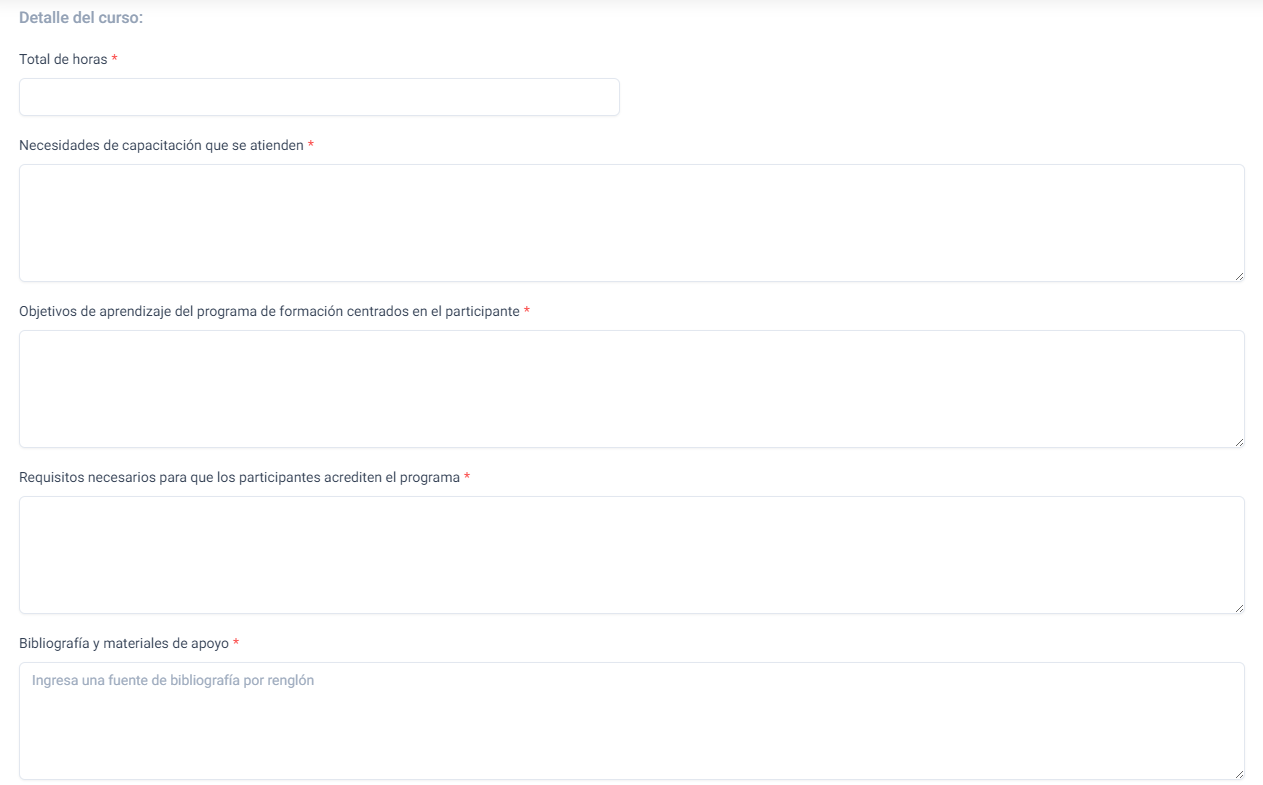 Al acceder a Solicitar curso, se muestra un formulario con varios campos importantes para la creación del curso. Es importante completar los campos marcados con el ícono *, ya que son obligatorios.
