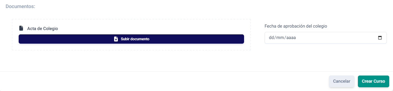 Para que un curso pueda ser aprobado es necesario contar con el documento Acta de Colegio cargado en el sistema y establecer una fecha de aprobación del colegio.