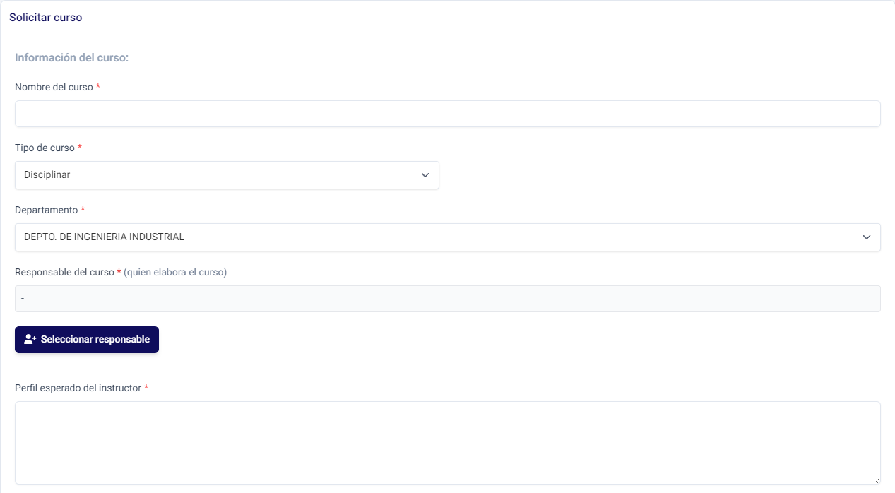 En este apartado se solicitan los datos básicos del curso, como su nombre, el tipo de curso, el departamento al que pertenece y el responsable del curso.