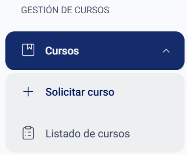 Servicios Académicos puede crear nuevos cursos si así lo desea. Para poder crear un curso, es necesario acceder al apartado Solicitar curso que se encuentra en el menú lateral: