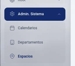 Se puede acceder al listado de espacios desde el menú lateral del sistema, solo habrá que localizar el apartado de Àdmin. Sistema y seleccionar Espacios.