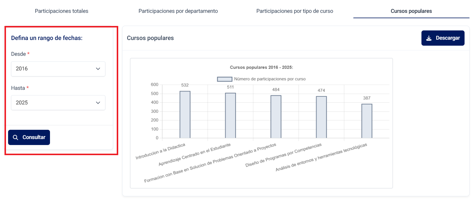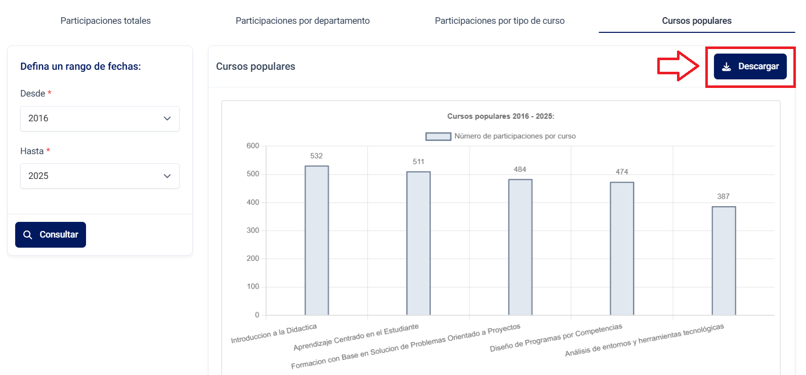 El gráfico de cursos populares puede ser descargado desde el botón de Descargar ubicado en la esquina superior derecha del gráfico.