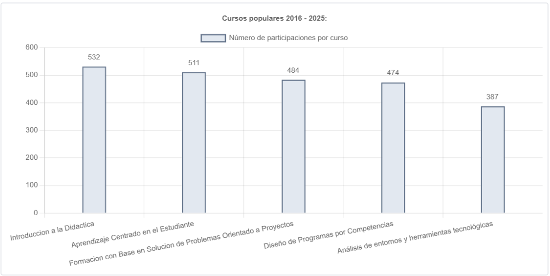 El gráfico de cursos populares utiliza un gráfico de barras para ilustrar los 5 cursos con más participaciones según un rango específico de años a consultar.