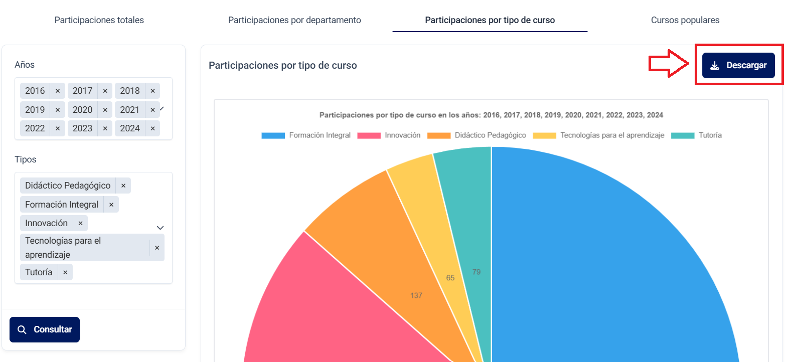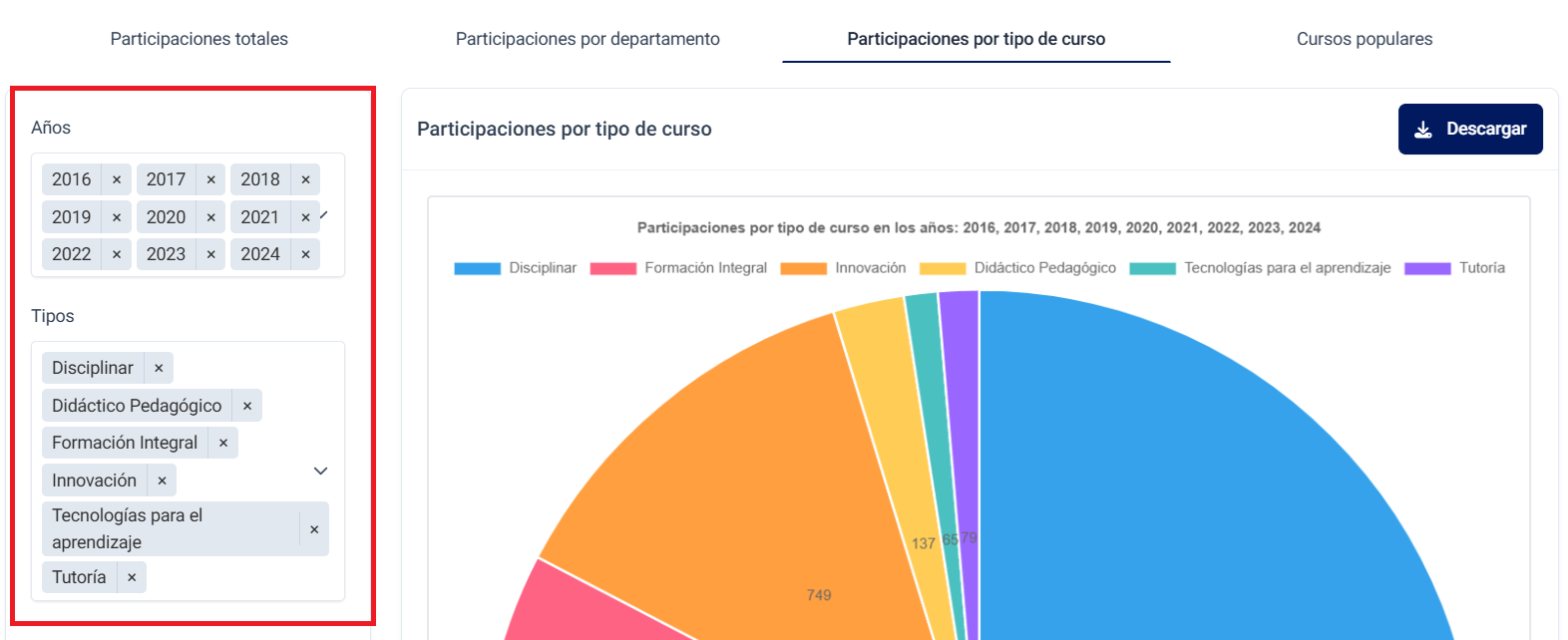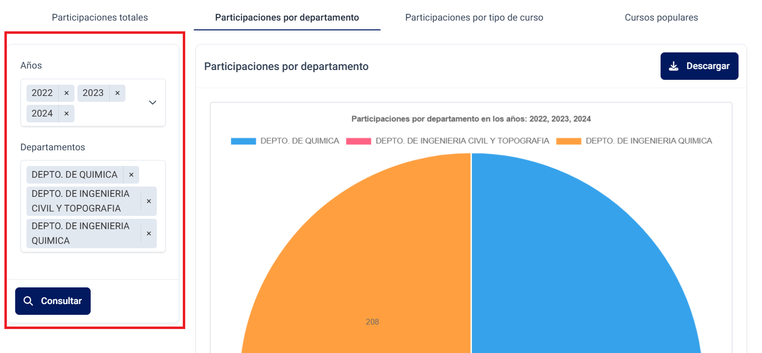Los gráficos, tanto de participaciones por departamento como por tipo de curso, pueden ser descargados desde el botón de Descargar ubicado en la esquina superior derecha del gráfico.