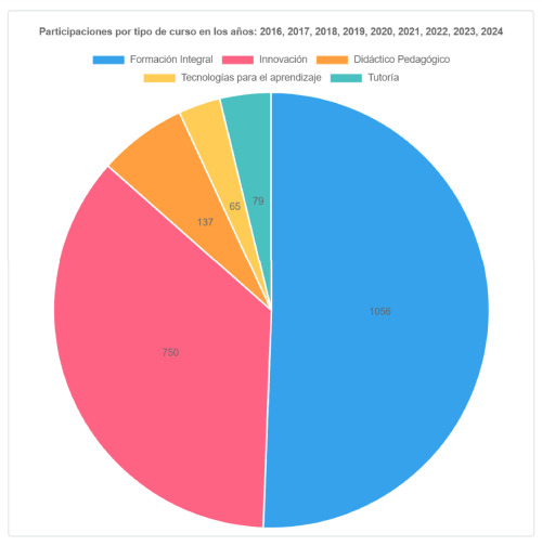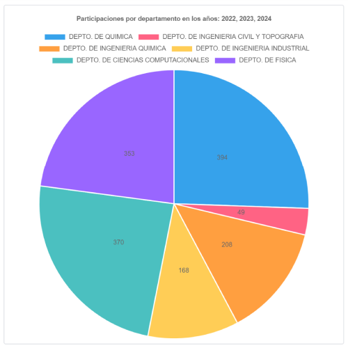 Los gráficos de participaciones por departamento y tipo de curso utilizan un gráfico pastel para ilustrar la contabilización de participaciones según un rango específico de años y de departamentos/tipos de curso a consultar.