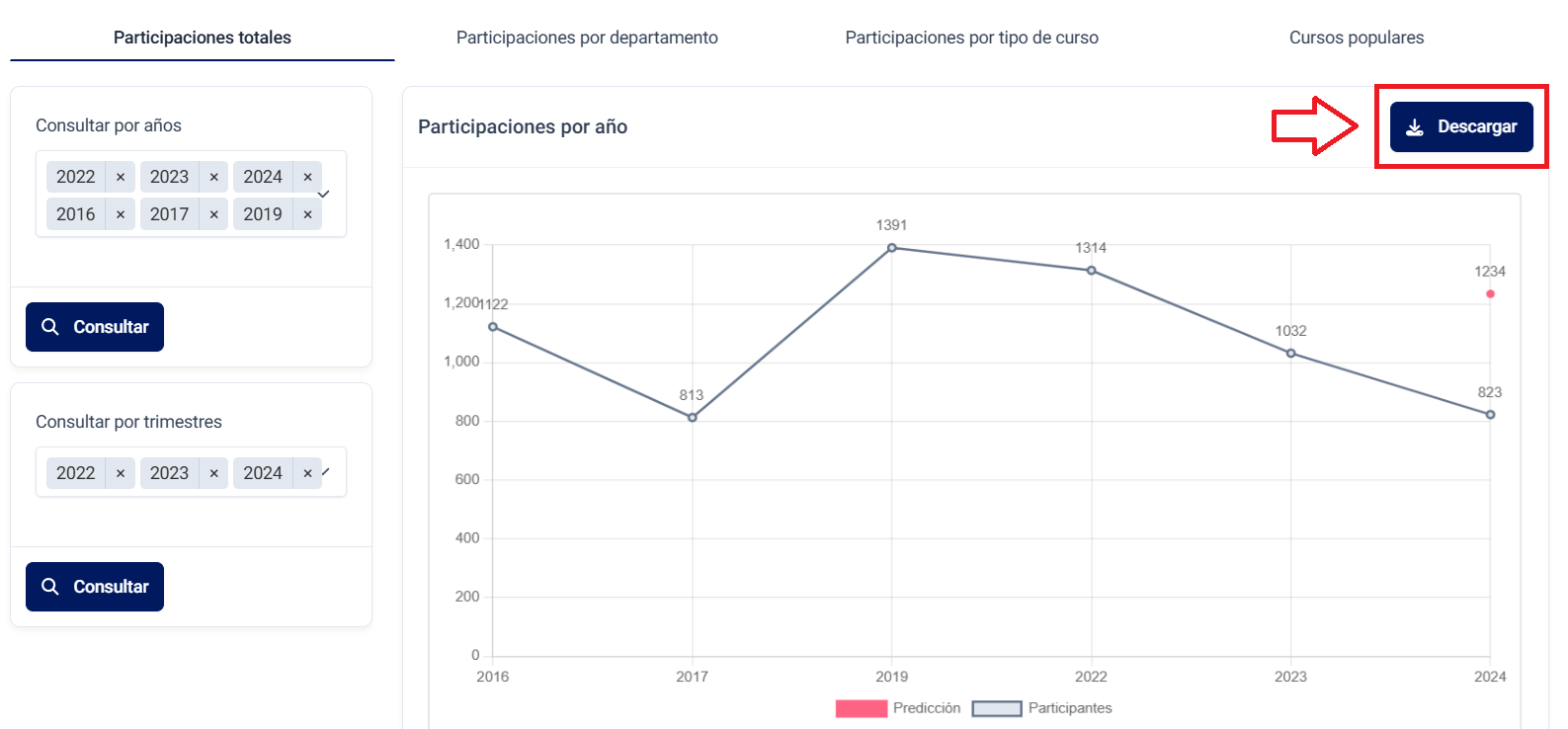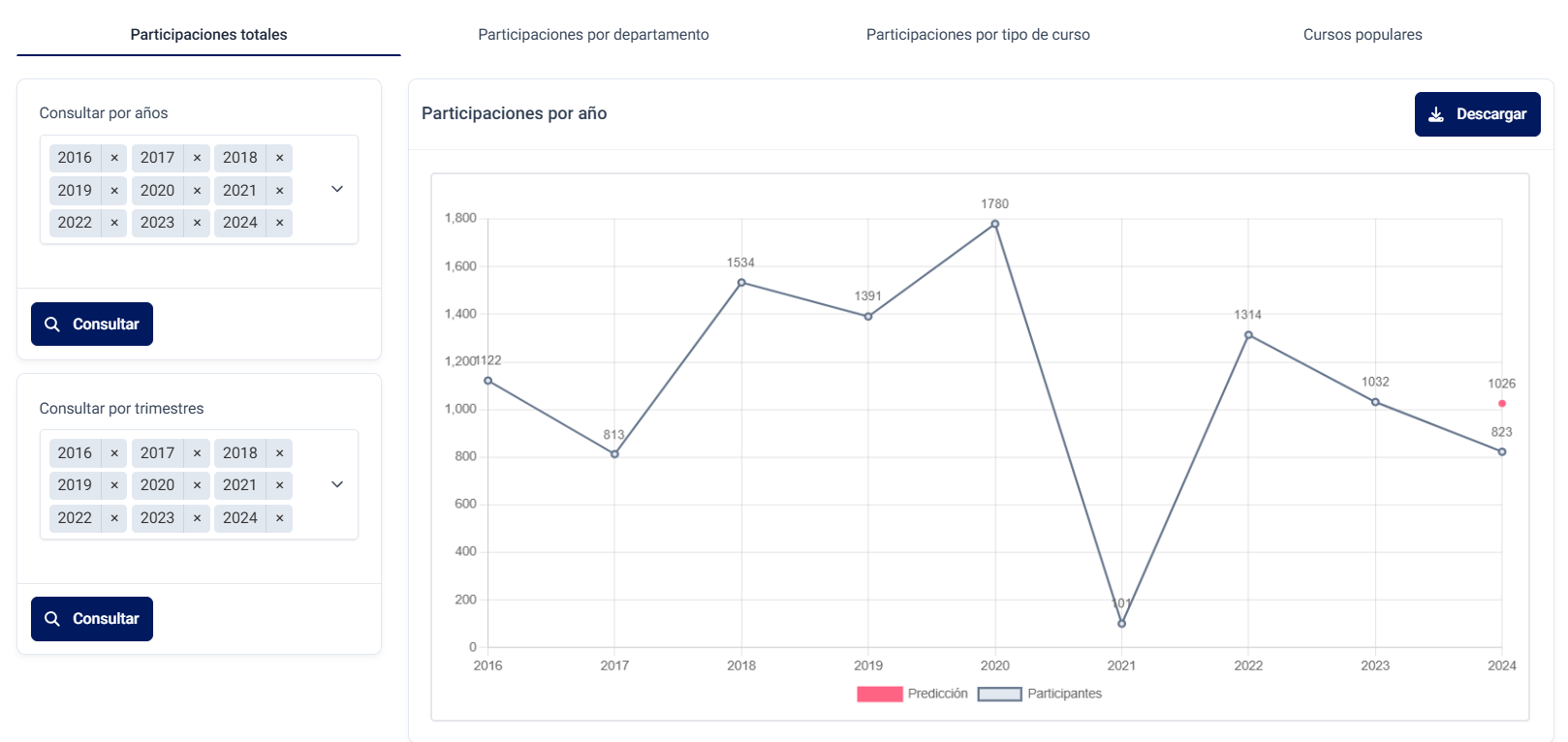Los gráficos de participaciones totales, sean consultados por años o trimestres, cuentan con un algoritmo de predicción que estima la cantidad de participantes en periodos específicos.