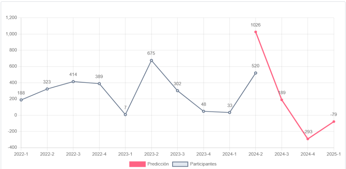 Cuando se consulta la gráfica por trimestres, se predice la cantidad total de participantes al finalizar el trimestre en curso y los próximos tres trimestres.