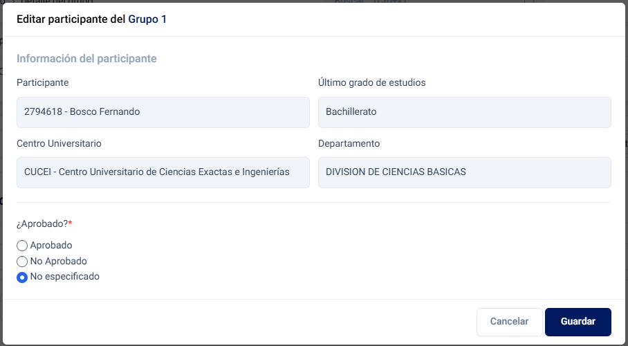 {warning} Servicios Académicos puede evaluar a los participantes de un grupo, sin embargo, es responsabilidad del instructor del grupo hacerlo.