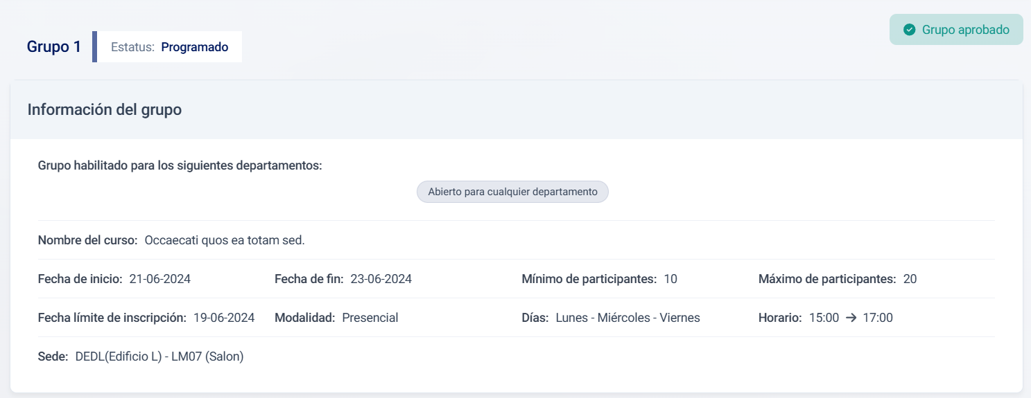 En el detalle de un grupo se puede visualizar la información general del mismo. Se incluye información importante como: Estatus, si está aprobado o no, para qué departamentos está abierto, horario, ubicación y modalidad.