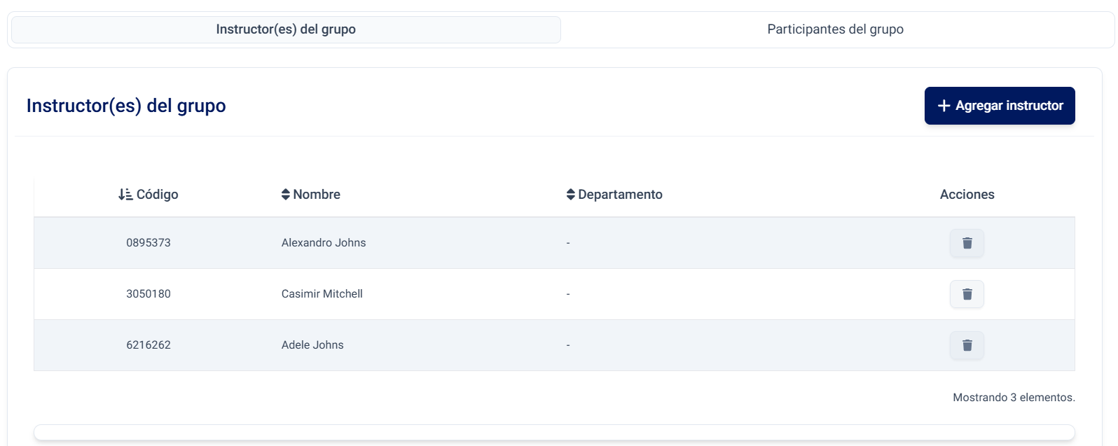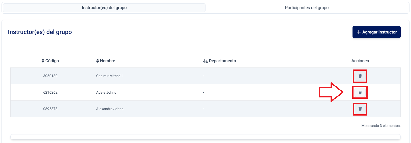 Puede eliminar instructores del grupo desde el Listado de instructores con el botón de bote de basura ubicado en la columna de Acciones.