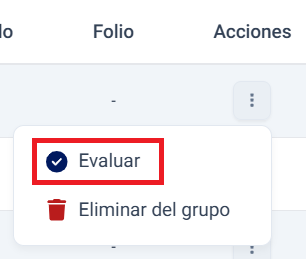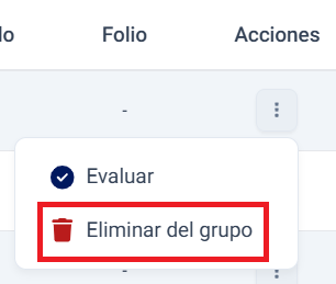 Puede eliminar participantes del grupo desde el Listado de participantes con la opción Evaluar ubicado en la columna de Acciones.