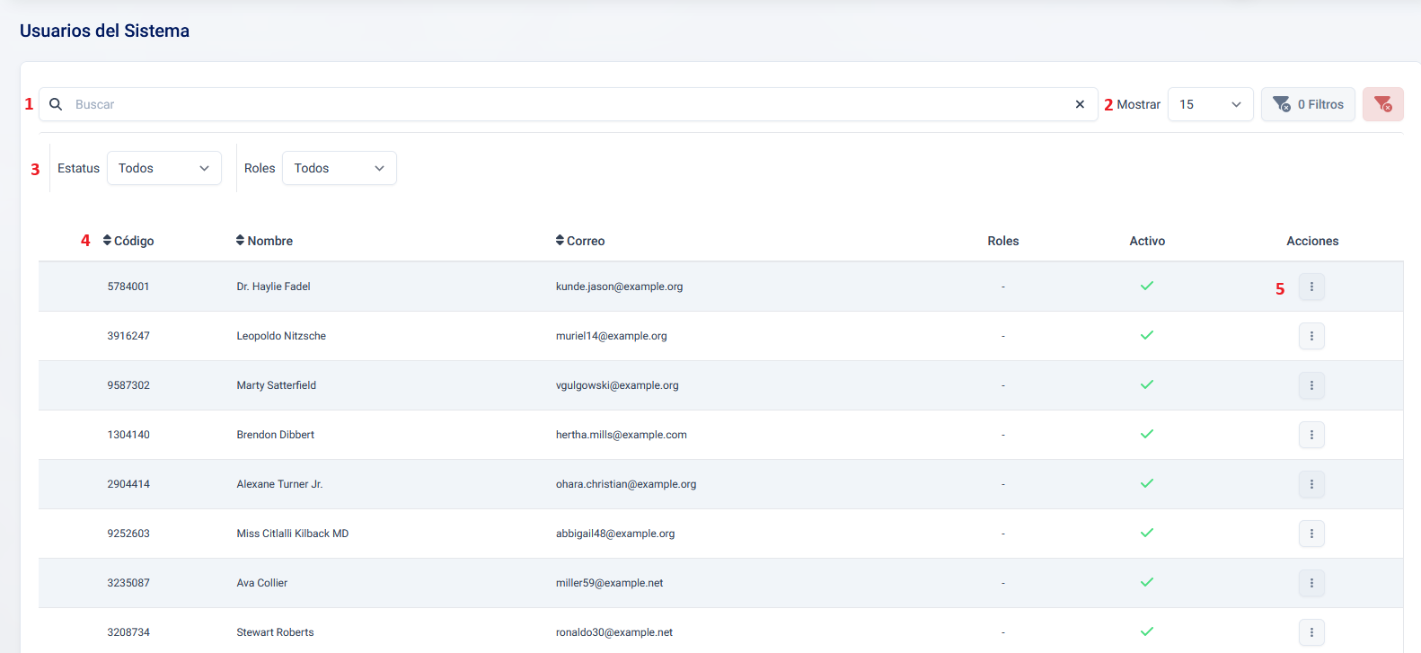 Los usuarios registrado en el sistema son enlistados en los Usuarios del Sistema, donde se pueden visualizar registros con las siguientes columnas: